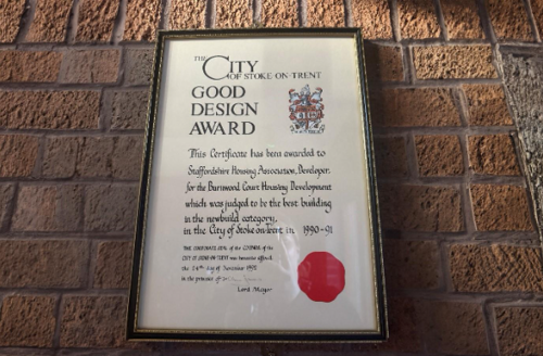 It was a Good Design Award, presented by the City of Stoke-on-Trent in 1990–91. The award recognised Burnwood Court as the best new-build development in the city at the time and was presented to Staffordshire Housing Association, as Staffs Housing was then known. Signed by the Lord Mayor at the time, Alan Jones, it marked a moment when new homes were being built with a clear purpose.